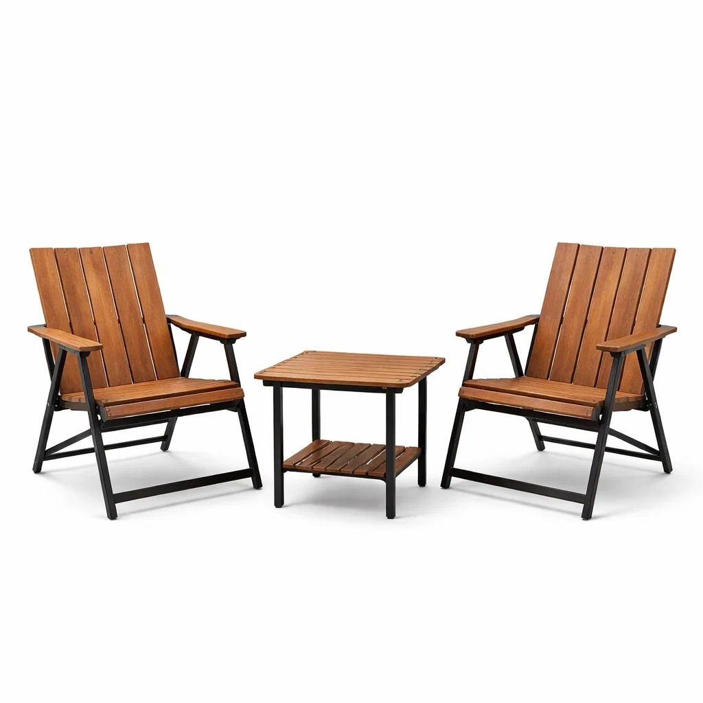 Questo set da giardino comprende due sedie realizzate in legno di acacia con struttura in acciaio verniciato e un tavolo quadrato abbinato. Le sedie offrono una seduta confortevole con un design a doghe, ideale per l'uso esterno.