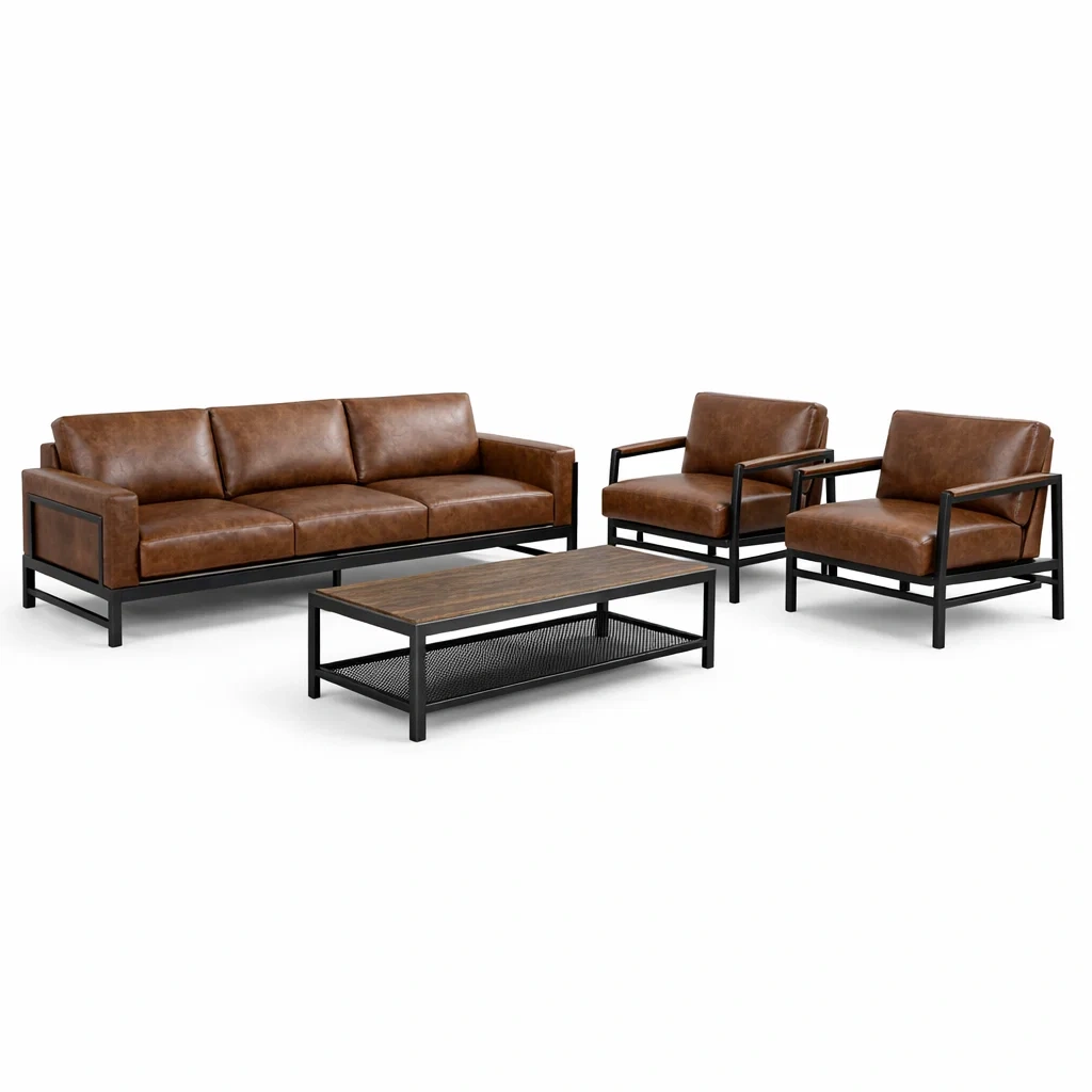 Set di divani con Poltrone in Similpelle, Struttura in Metallo e Tavolino in Legno MDF